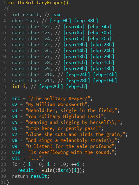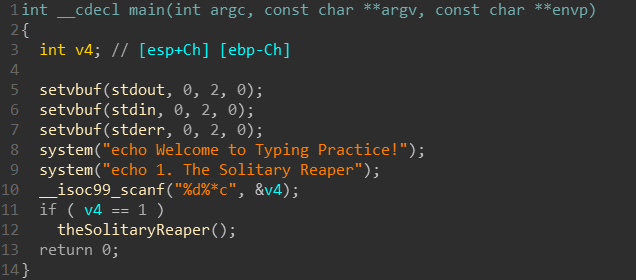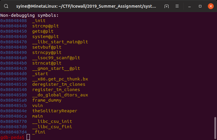 payload += p32(0x804864E) # func: theSolitaryReaper