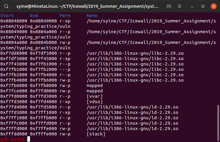 gdb의 vmmap으로 확인해 보면 0x804A000부터 0x804B000까지의 고정 영역에 대한 write 권한이 있다. 이를 이용해 BOF로 gets를 호출하고 해당 영역에 "/bin/sh" 문자열을 쓴 뒤 system 함수를 호출해 인자로 "/bin/sh"를 넘겨주는 방식으로 shell을 얻는 시나리오를 설계했다.