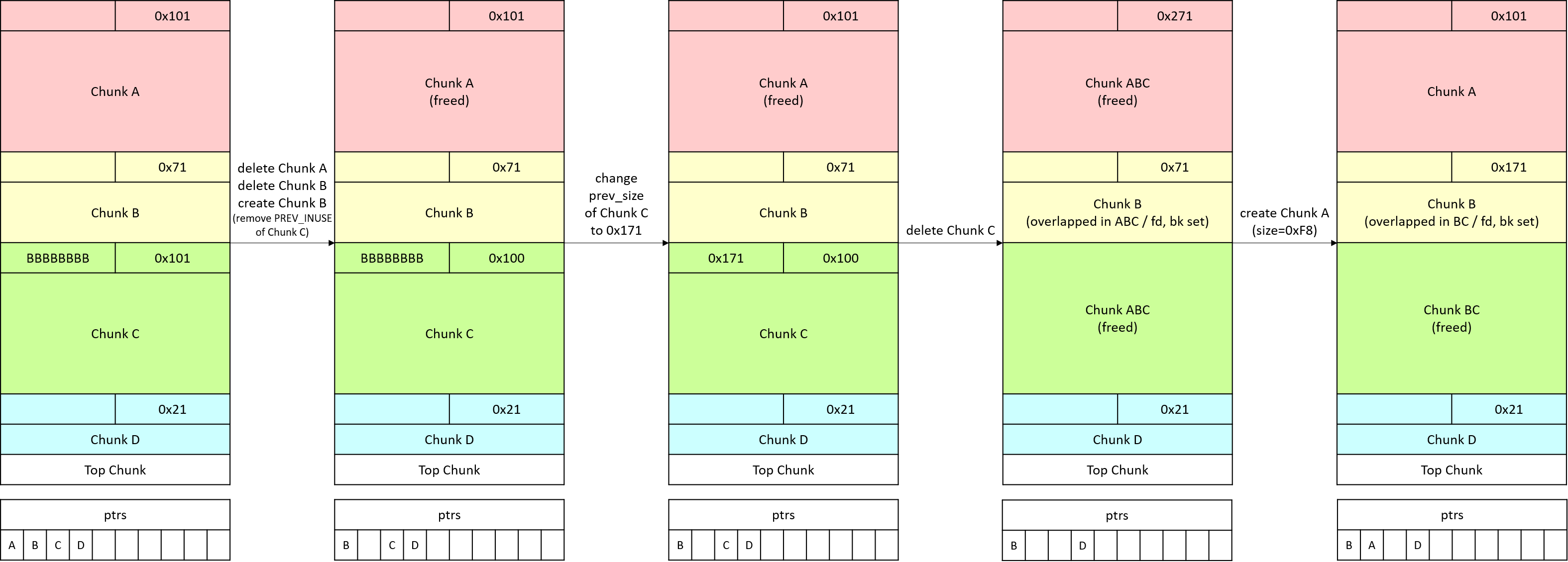 3. Chunk B를 free하고 만드는 것을 반복해서 Chunk C의 prev_size 필드를 BBBBBBBB에서 0x171로 바꾼다. NULL 바이트는 strcpy에 의한 마지막의 1바이트밖에 못 들어가기 때문에 반복 작업으로 뒤의 6바이트 NULL을 채우고, 앞의 두 바이트를 \x71\x01로 바꾸면 된다.