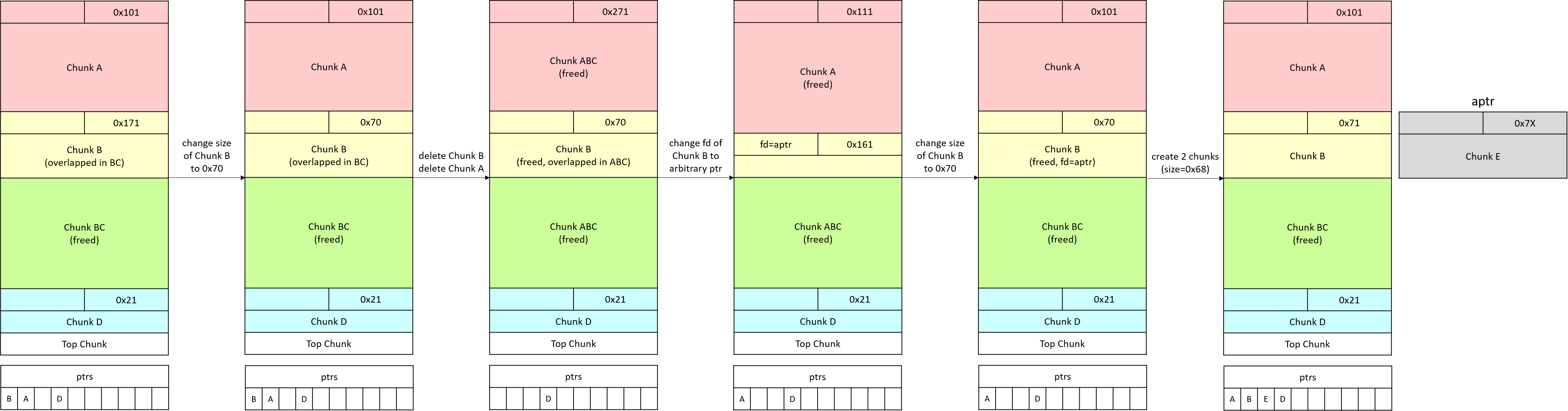 libc 주소를 구했고, overlapped chunks가 있으니 $pc를 조작할 수 있다.