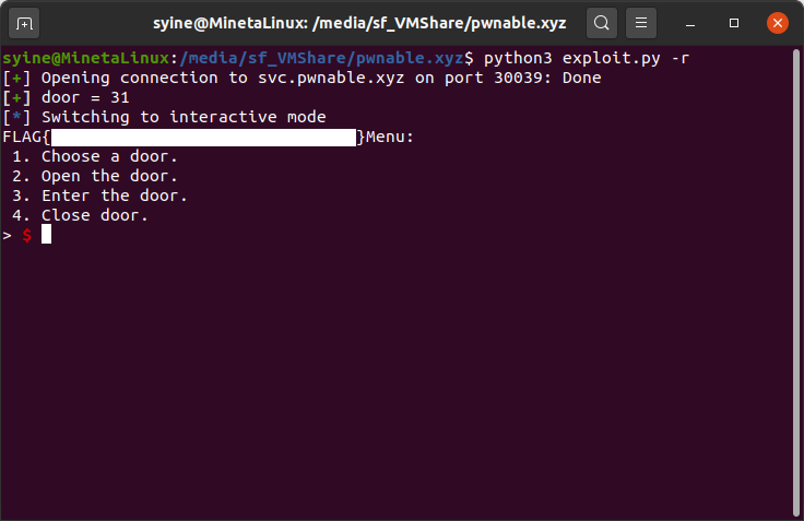 4. 3 > 0x601245에 NULL을 쓴다. 이 과정 후 door의 값은 0부터 0xFF 중 하나가 된다. (door를 바로 0으로 만들어버리면 2번 메뉴가 실행되지 않는다)