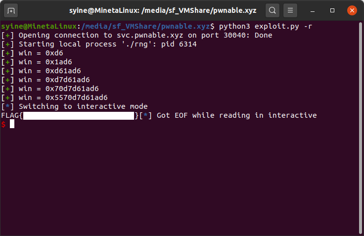 초기 상태에서 do_seed를 실행해서 확인하면 rand의 반환값은 0x6b8b4567이고, s는 0이다. 이후에 rand를 적절히 돌려서 win의 주소를 구하고 main의 stack ret에 win의 주소를 쓰면 된다.