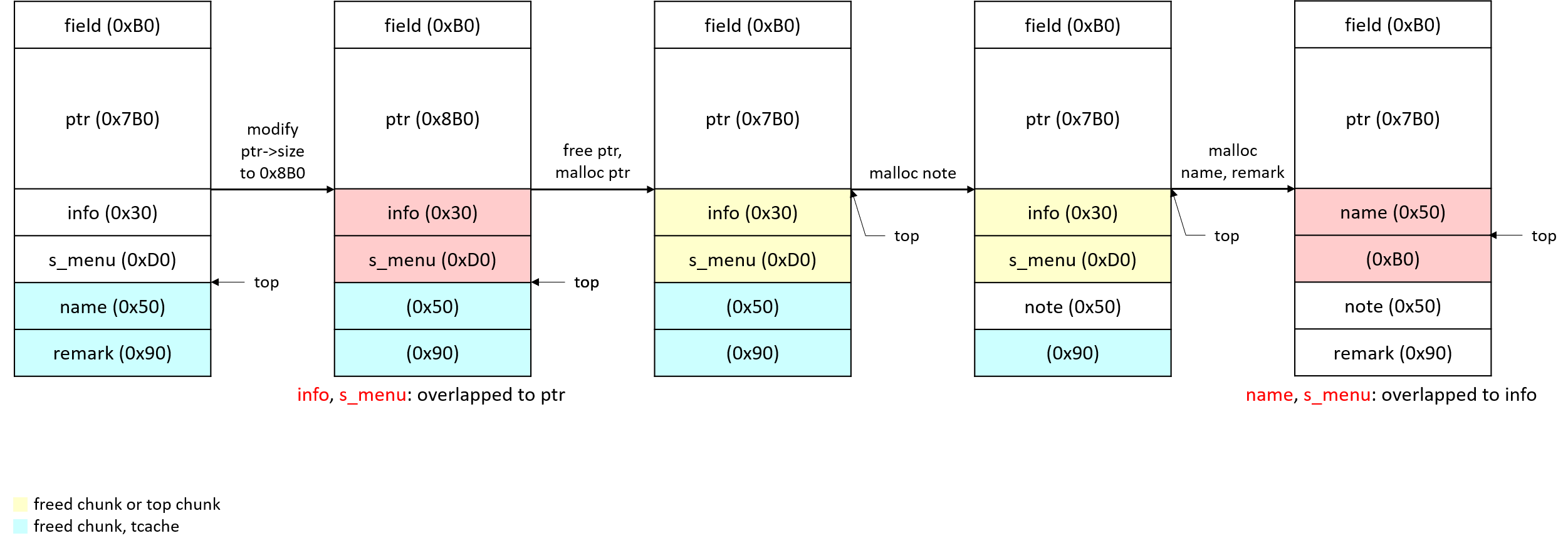 4. drop_note로 0x50 크기의 tcache entry를 비우고 나면 update_hiscore에서 할당받는 0x50 크기 chunk는 top chunk에서 할당받게 된다. 즉 이름을 쓰는 곳에 값을 잘 넣어서 info 구조체를 막 수정할 수 있다.
