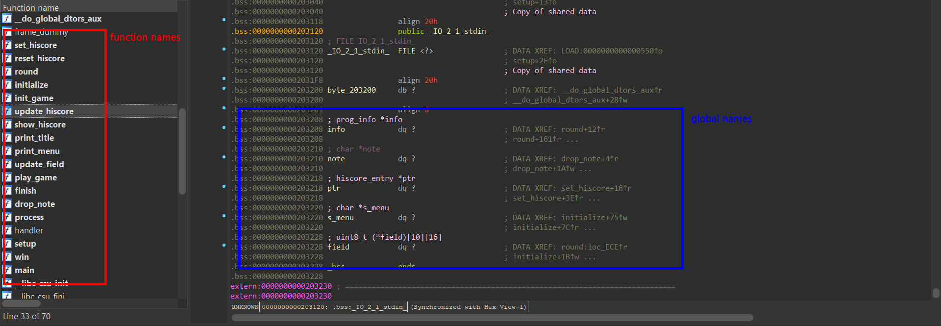 바이너리가 strip 되어 있기 때문에 먼저 이름을 다 붙여준다.