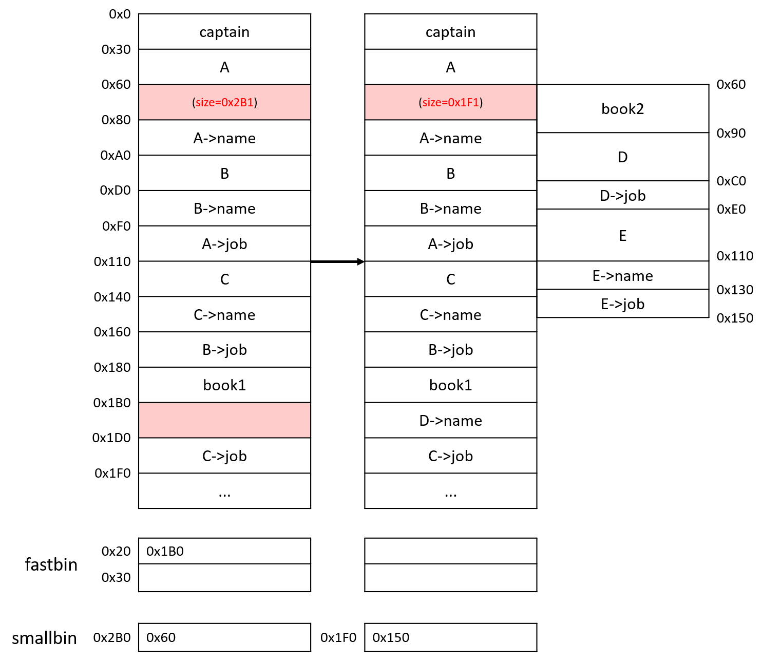 libc 주소를 leak 한 뒤 E를 만들면 name과 job이 뒤바뀐다. E->job을 수정해서 C의 name과 job 포인터를 자유롭게 움직일 수 있다.
