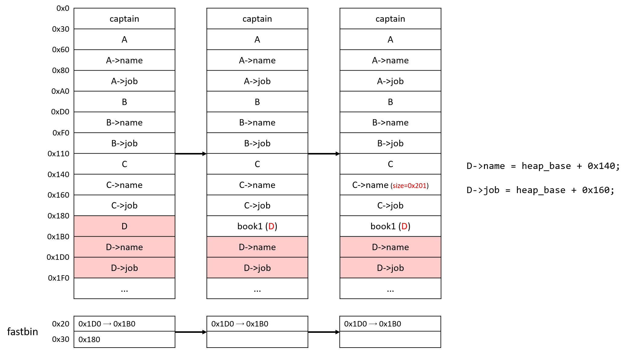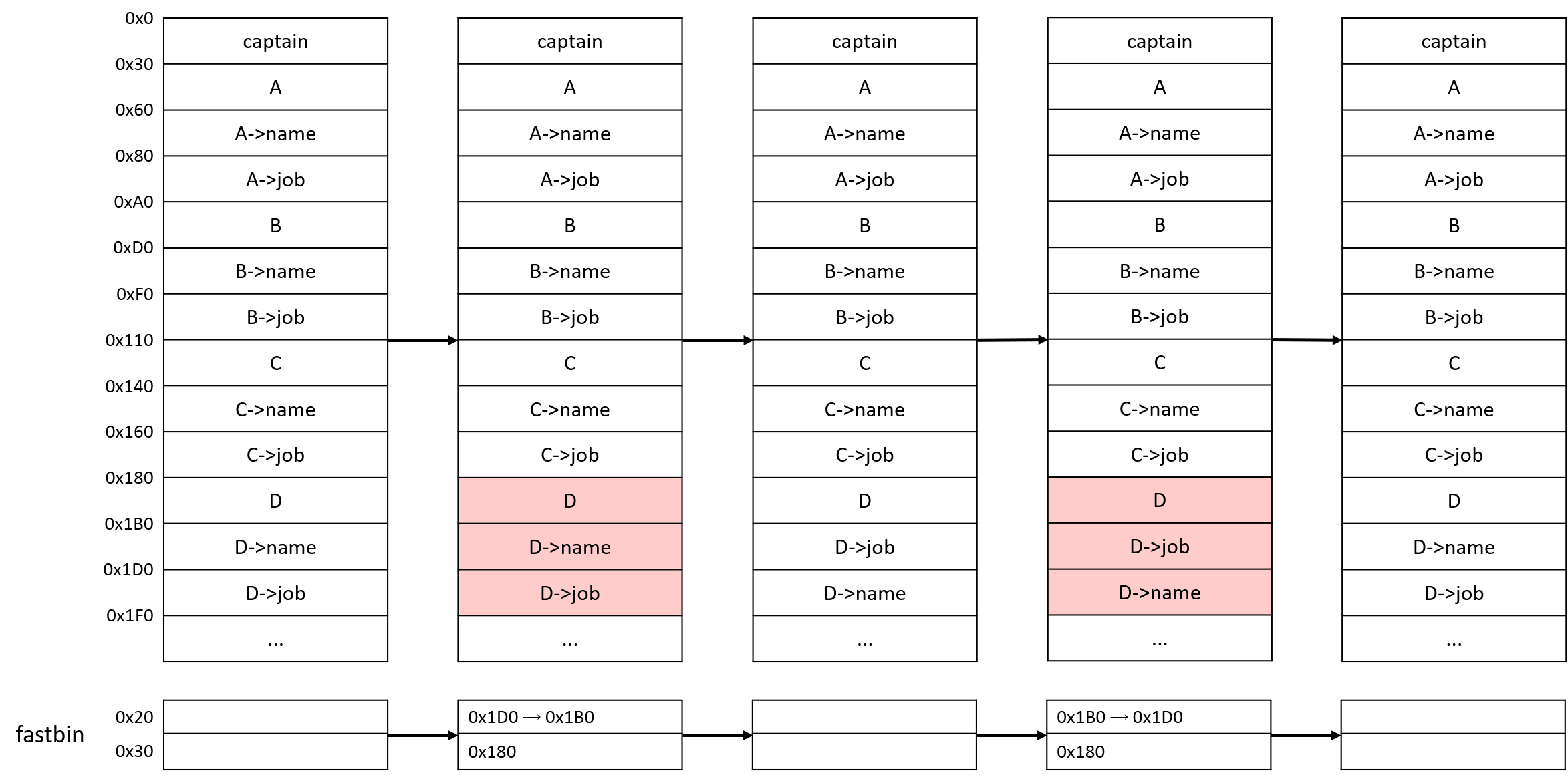 2. D를 삭제한다. D를 지우면 D->job이 있던 chunk는 fd에 D->name의 위치를 저장하고 있다. (fastbin)