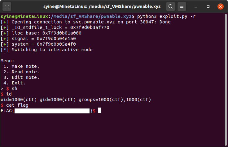 read_note 대신 edit_note를 실행하면 AAW를 할 수 있다. 그런데 플래그를 어떻게 가져올 지 몰라서 한참 동안 살펴본 결과, strtol을 system으로 덮고 숫자를 입력하는 부분에 cat flag를 넣어서 풀 수 있었다. (sh를 넣어서 shell spawn도 할 수 있다)