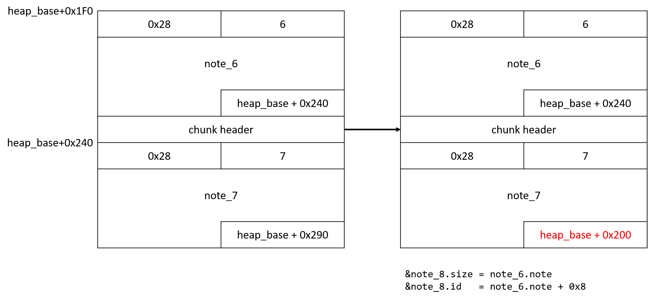 id가 7인 Note의 next 포인터를 조작해서 heap_base+0x200 으로 바꾸면, note_8의 size와 id 필드를 note_6에서 바꿀 수 있고, note_8에서 note_6의 next 포인터를 조작해서 note_7 위치를 바꾸고 특정한 주소의 값을 읽거나 쓸 수 있다.