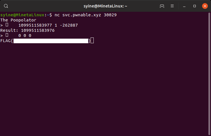 { n = 0LL; printf(format); c = _isoc99_scanf("%ld %ld %ld", &x, &y, &n); if ( !x || !y || !n || n > 9 || c != 3 ) break; result[n] = y ^ x; argv = (const char **)result[n]; printf("Result: %ld\n", argv); } |