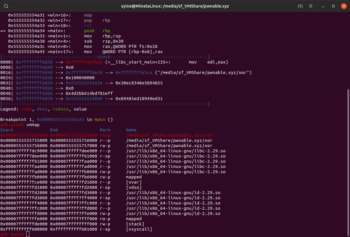 바이너리를 실행하고 프로세스의 메모리 매핑 상태를 살펴보니 0x0~0x1000 범위에 RWX 권한이 있다는 점이 눈에 띈다.