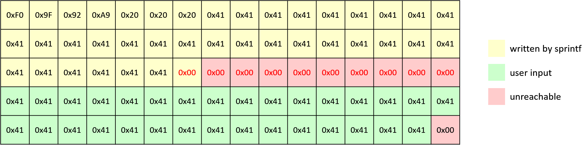 cmd[0x20] 을 출력하는 부분에서 FSB를 성공적으로 활용하려면, 위 그림에서 빨간색으로 표시된 10바이트를 NULL이 아닌 다른 바이트로 바꿔 cmd[0x20] 이 사용자 입력을 포함하도록 해야 한다.