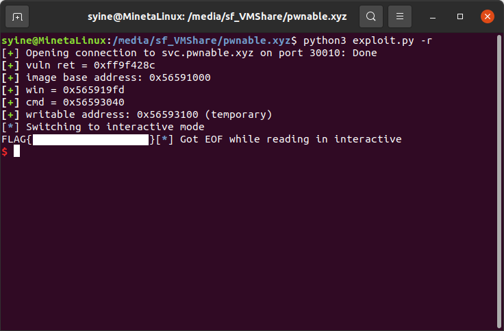 위 과정을 10번 반복해서 빨간색으로 표시된 10바이트를 NULL이 아닌 값으로 대체한 후, 사용자 입력에 FSB payload를 넣어서 win 함수를 실행한다.