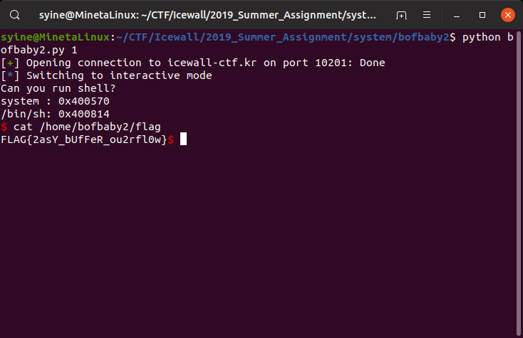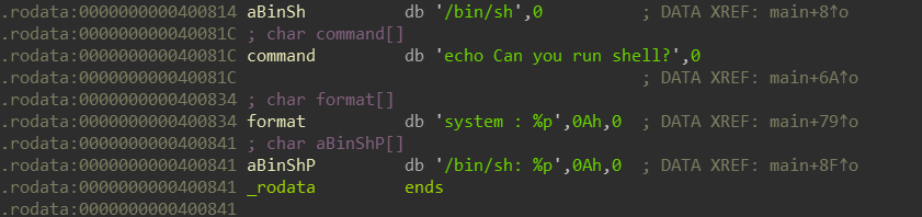 "/bin/sh" 는 0x400814, system@plt는 0x400580, pop rdi; ret;는 0x4007F3에 위치한다. 이들을 이용해 exploit을 작성한다.