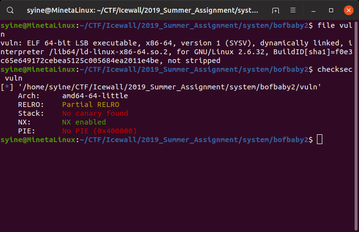 64bit ELF 바이너리 파일이고 NX만 걸려있다. bofbaby1와 완전히 똑같은 문제지만, 아키텍쳐만 바뀌었을 뿐이다.